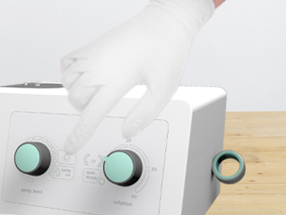 Intuitive Einstellung der Behandlungsparameter (Sprayintensität und Rotationsgeschwindigkeit) über Drehregler. Rotationsrichtung ändern per Knopfdruck (Re/Li).