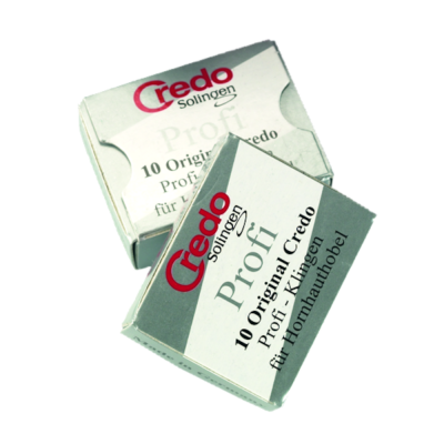 Die CREDO Profiklingen zeichnen sich aufgrund ihres einzigartigen Schliffs durch eine enorm hohe anfängliche Schneidfähigkeit aus. Deshalb werden diese Klingen gerne von professionellen und führenden Fußpflegern und Podologen verwendet. Diese wechseln aus hygienischen Gründen ohnehin die Klingen nach jeder Behandlung aus und benötigen von daher eher die extrem hohe anfängliche Schneidfähigkeit als eine lange anhaltende Schneidfähigkeit. 100 Hornhaut-Hobel-Klingen, einzeln verpackt in Paraffinpapier zum Schutz vor Nässe. Jeweils 10 Klingen in einer kleinen Klingenbox. Made in Solingen, Germany.