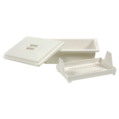 Desinfektionswanne mit großem Fassungsvermögen und Spritzschutz-Deckel, für Institute mit hoher Kundenfrequenz und entsprechend höherem Bedarf. Alle Teile aus stabilem, weißem Kunststoff. Resistent gegen Desinfektions- und Reinigungsmittel aller Art.
