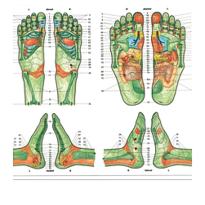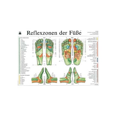 Die Reflexzonen der Füße werden auf der großformatigen Lehrtafel durch farbige Abbildungen und Kennzeichnungen anschaulich dargestellt.