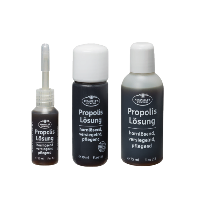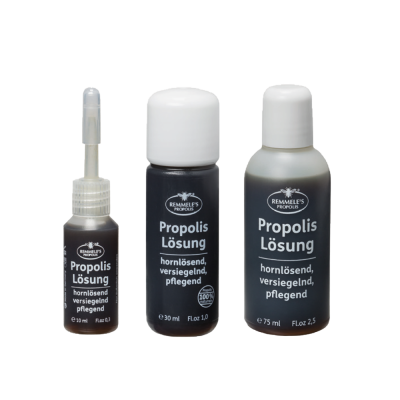 Die Lösung ist nicht wasserlöslich, da es sich hierbei um ein Harz handelt. Sie dringt nicht in tiefe Hautschichten ein, sondern legt einen schützenden Film über die Hornschicht der Haut (Filmbildner). Sie lockert überschüssige Verhornungen “mechanisch” auf und erleichtert so das Abtragen. Die darin enthaltene Trockensubstanz unterstützt die Elastizität und Geschmeidigkeit der Haut. Die in Propolis enthaltenen Bioflavonoide wirken einer Vermehrung von Mikroorganismen (Keime) entgegen.