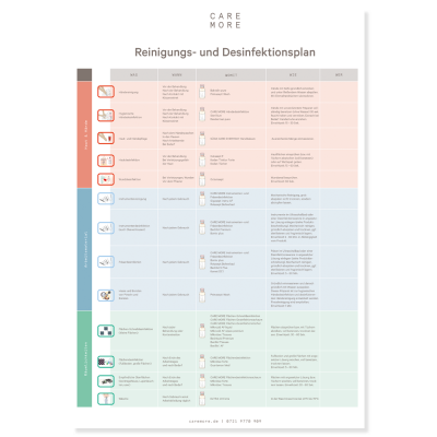 Dieser Plan erläutert Ihnen übersichtlich alle notwendigen Maßnahmen zur Reinigung bzw. Desinfektion von Händen, Haut, Arbeitsmaterialien und Räumlichkeiten.