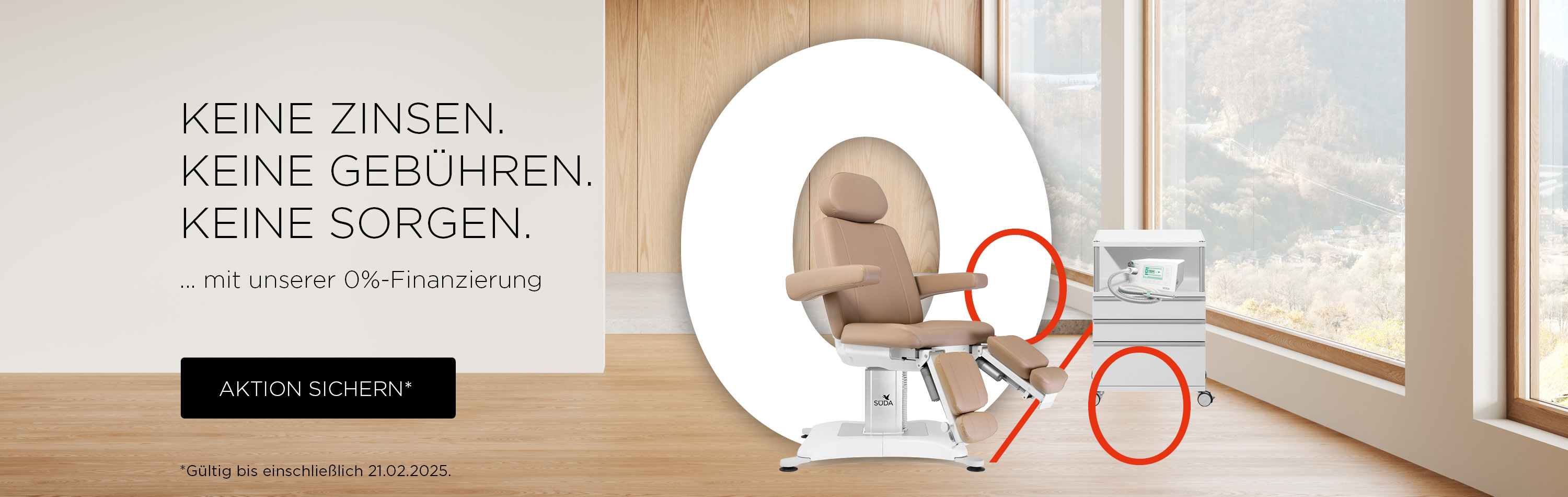Mit unserer 0%-Finanzierung haben Sie jetzt die Gelegenheit, in die Zukunft Ihres Geschäfts zu investieren – ganz ohne Zinskosten oder versteckte Gebühren. Diese Aktion läuft vom 21.01.2025 - 21.02.2025 und ist mehr als eine Finanzierungslösung; es ist unser Beitrag, Sie auf Ihrem Weg zum langfristigen Erfolg zu unterstützen. Wir verstehen die Herausforderungen, die mit der Führung einer eigenen Praxis einhergehen. Die richtigen Entscheidungen heute legen den Grundstein für Ihre erfolgreiche Zukunft.