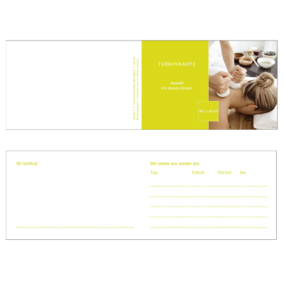 Hochwertige und schicke Terminkarten in drei verschiedenen Varianten für Kosmetik, Fußpflege und Wellness erhältlich. Aufklappbar, im Format 8,5 x 5,6 cm, mit freien Feldern für individuelle Textbefüllung und Stempeleindruck.